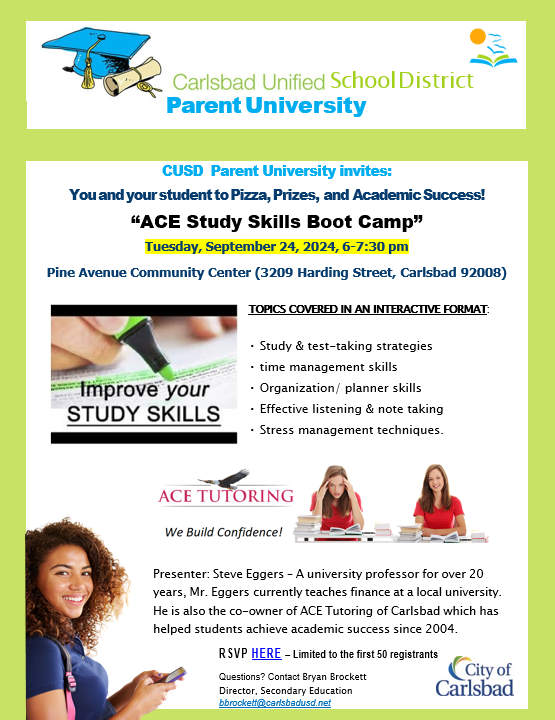 Does your student need assistance with homework or just need a morning check in before school? You are in luck! We have Learning Lab Monday-Thursday mornings from 7:45-8:15. Please see the flyer below for room numbers. If you have any questions about Learning Lab, please email Mrs. Rines srines@carlsbadusd.net .