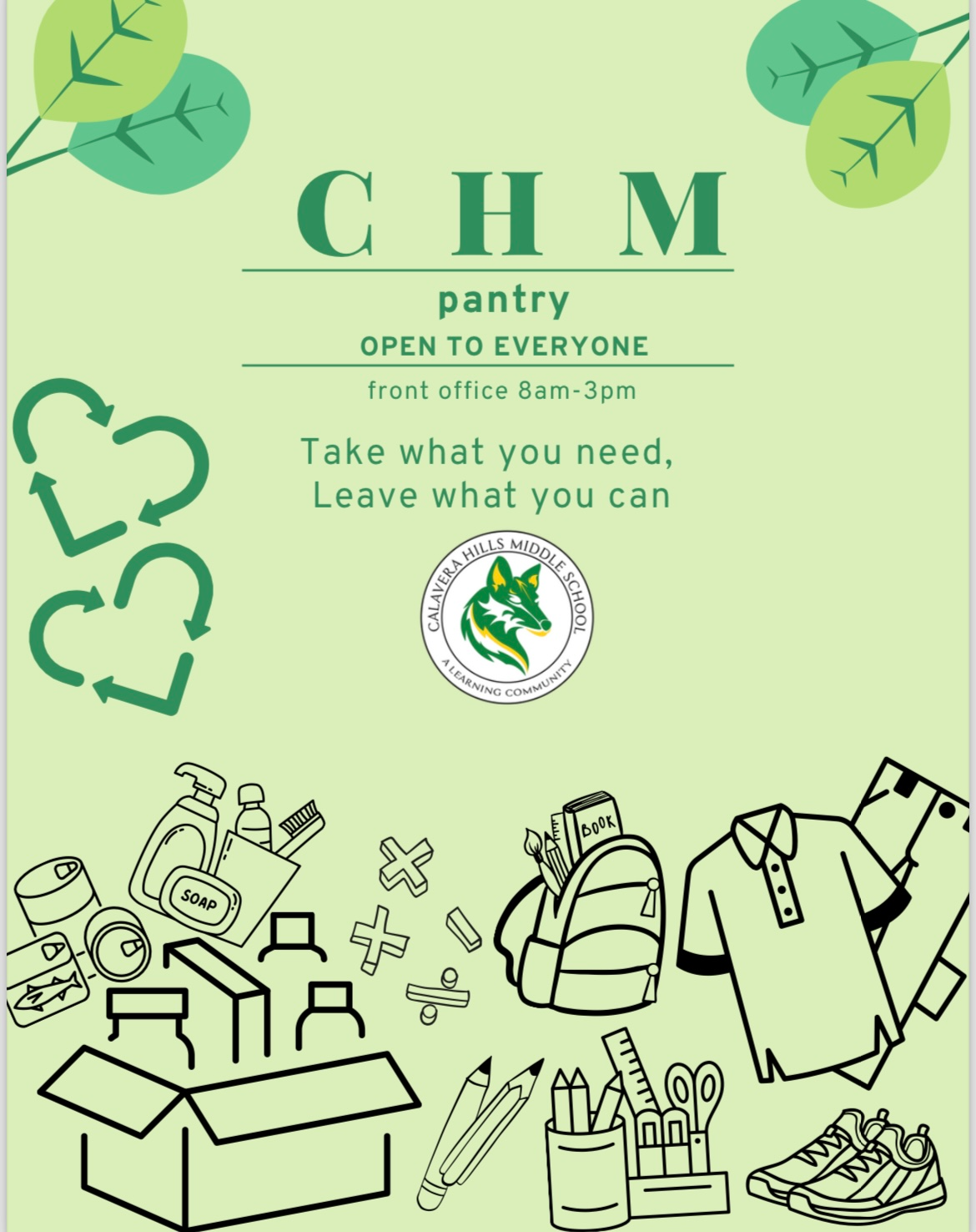 We are excited to announce the opening of our new food pantry at Calavera Hills Middle School! Our pantry follows the simple principle of “Leave what you can, take what you need.” It’s a great way for our community to come together and support one another.
