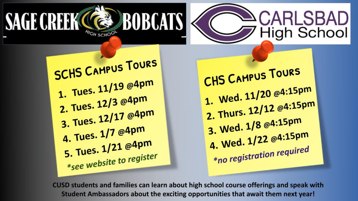your student prepare for the high school selection, Carlsbad High School and Sage Creek High School will be offering tours for incoming students and families beginning later this month. Please click on the links above to access each school's tour information and see the tour dates below.