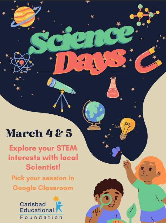 Science teachers and students have been preparing for our upcoming annual Science Days! Last week, students submitted their preferences for the upcoming Science Days and next Tuesday and Wednesday, students will participate in hands on learning with local scientists. This event is made possible with the support of the Carlsbad Educational Foundation and we are so thankful for their help! The bell schedule will stay the same for each day, students just attend during their regularly scheduled science class. However, you will see some of the vendors on campus! For example, Millipore Sigma will have their Curiosity Cube located in the parking lot starting Monday after school. Feel free to say hello to the scientists, but remember that it's part of our science day sessions during the school day. Any questions or comments? Reach out to Katie Ohlin or Sarah Rines, our CHMS Science Day Co-Coordinators.